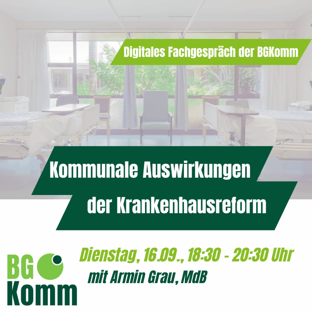 Am 16. September 2025 fand unser digitales Fachgespräch mit Armin Grau, MdB, zum Thema „Krankenhausreform – Was bedeutet sie für die kommunale Ebene?“ statt. Mehr Infos und Aufzeichnung.